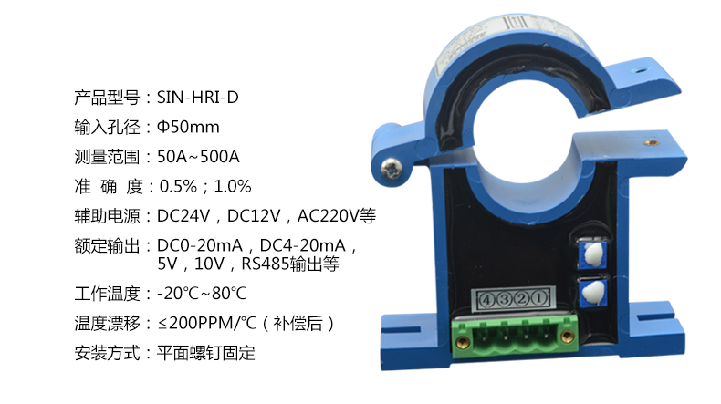 電流變送器可以直接將被測主回路交流電流或者直流電流轉換成按線性比例輸出的DC4~20mA(通過250Ω 電阻轉換DC 1~5V或通過500Ω電阻 轉換DC2~10V)恒流環標準信號,連續輸送到接收裝置(計算機或顯示儀表)。